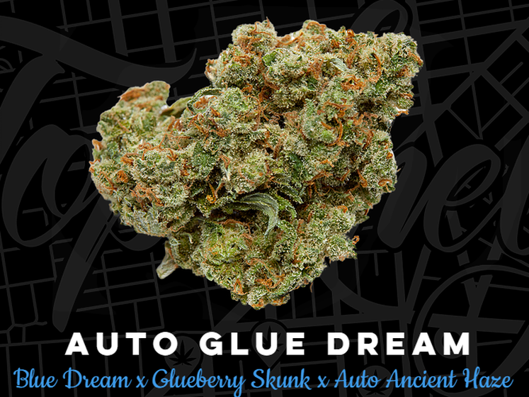 Certainly one of Californias leading strains of modern times. An especially pungent Blue Dream phenotype has been meticulously crossed with two of Top Shelf’s early unreleased projects- Glueberry Skunk and Ancient Haze. In rigorous testing and selecting it was agree that this genetic profile maximizes what’s great in the original strain by adding more depth to the haze and berry, increasing trichome production whilst maintaining the clear, euphoric Sativa effects that mean for a sumptuous daytime choice. A beautiful, heavy yielding pheno of Blue Afghani was used in the breeding of Glueberry Skunk to further add depth to the sweet deep Blueberry/Mango taste and give weight to buds. Flowers are numerous, large, often blue/silver in color and sticky as hell…the combination of these sticky, clear trichomes and the pale blue buds make for a ghostly, ethereal look to the plant in full flower.